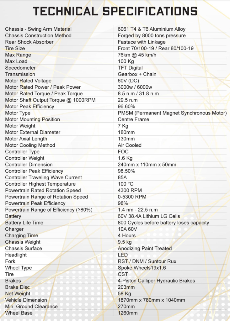 STING is powered by an impressive 60V 38Ah lithium-ion power pack, which is 2280 watt-hours, and easily swappable. The power packs can be exchanged with another fully charged power pack in seconds for limitless range. With electric automobile grade LG 21700 lithium-ion battery cells, state of the art programmed BMS, and optimized internal structure, this battery pack is enabled to ensure the bike brings you safe, high performance off-road riding.